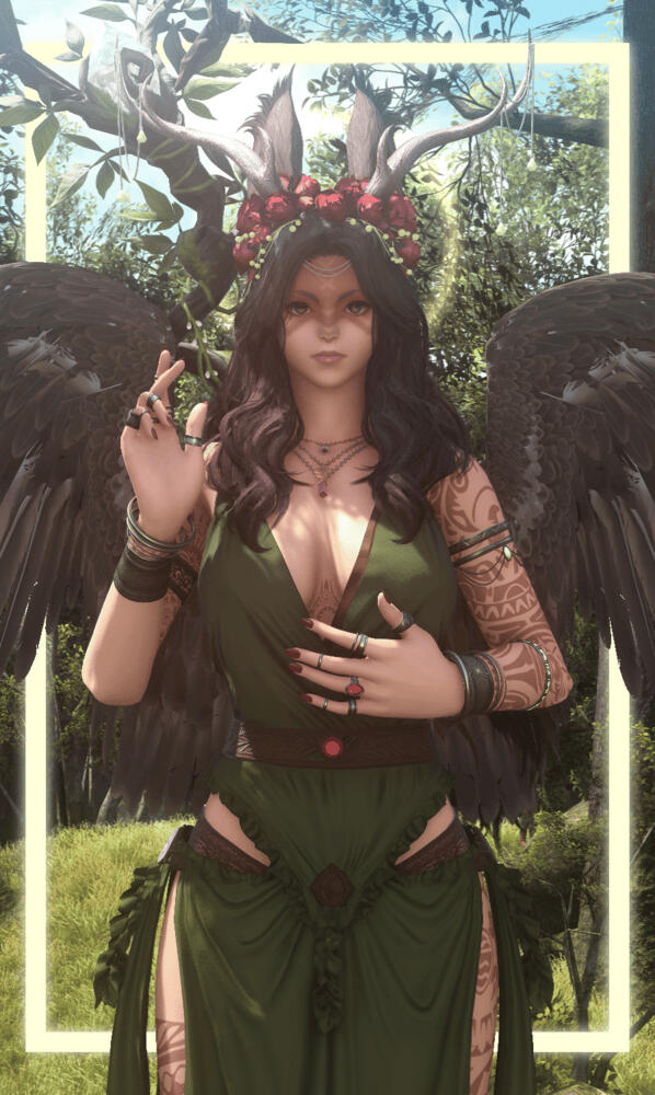 FOREST GUARDIANThe spirit of the forest. This White Mage glam is inspired by the concept of Mother Goddesses. Her portraits are based off of renaissance and religious paintings.